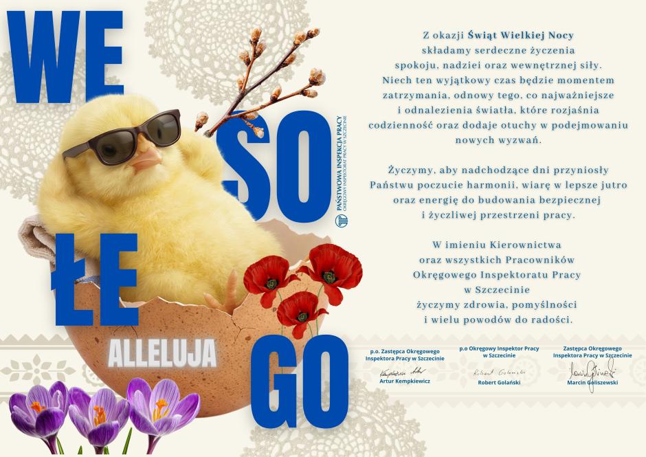 Z okazji Świąt Wielkiej Nocy składamy serdeczne życzenia spokoju, nadziei oraz wewnętrznej siły. Niech ten wyjątkowy czas będzie momentem zatrzymania, odnowy tego, co najważniejsze i odnalezienia światła, które rozjaśnia codzienność oraz dodaje otuchy w podejmowaniu nowych wyzwań. Życzymy, aby nadchodzące dni przyniosły Państwu poczucie harmonii, wiarę w lepsze jutro oraz energię do budowania bezpiecznej i życzliwej przestrzeni pracy. W imieniu Kierownictwa oraz wszystkich Pracowników Okręgowego Inspektoratu Pracy w Szczecinie życzymy zdrowia, pomyślności i wielu powodów do radości.